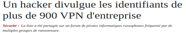 Au mois de juillet, un pirate a d’ailleurs diffusé les identifiants VPN (avec le login et mot de passe en clair) de centaines entreprises.